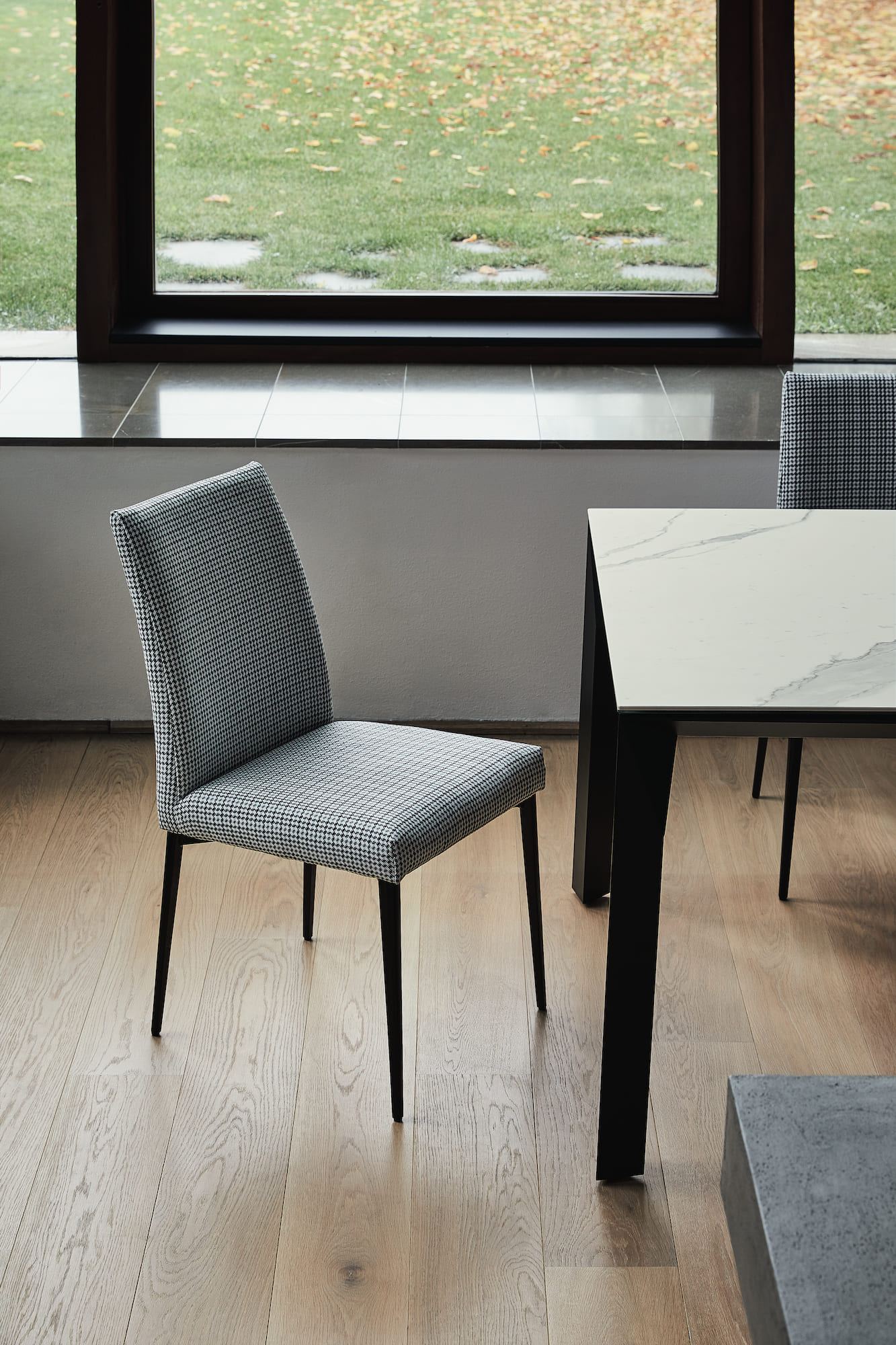 Sedia con struttura in Acciaio. Seduta e schienale imbottiti e rivestiti.