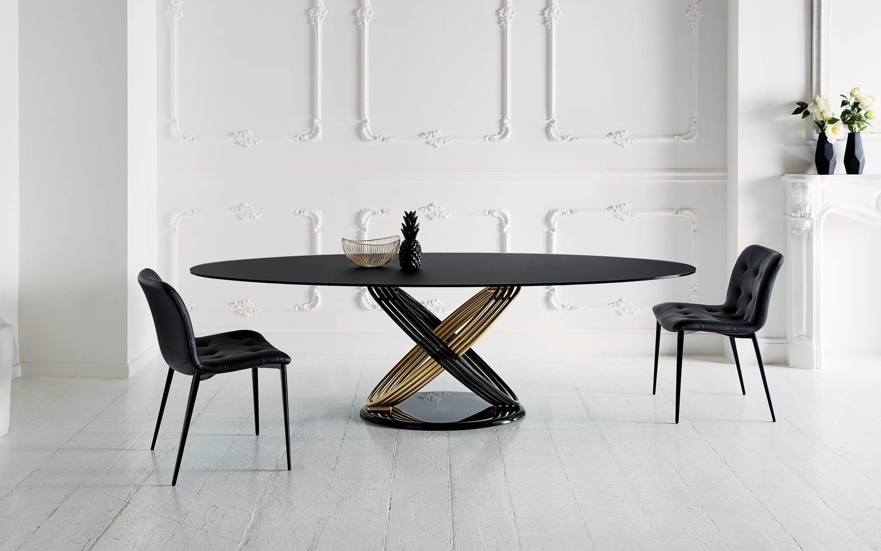 Стол нераскладной или раскладной со структурой в форме колец из лакированной стали. Основание из лакированной стали, шпонированного дерева или СуперМрамора. Столешница из массива дерева, массива вековой древесины, шпона с краями из массива, шпона, стекла, стекла, устойчивого к царапинам, натурального мрамора, СуперМрамора и СуперКерамики