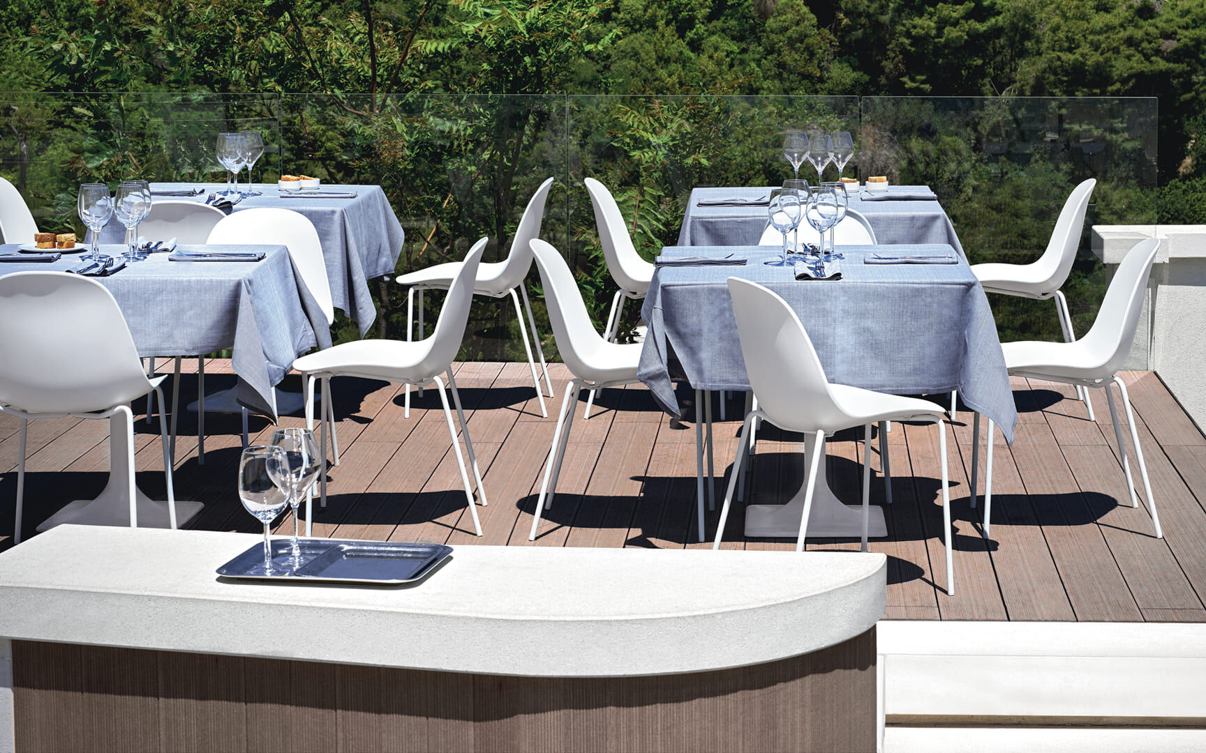 Стул/Стулс подлокотниками, со структурой из лакированной стали для использования внепомещений, монолитное сидение из полипропилена.