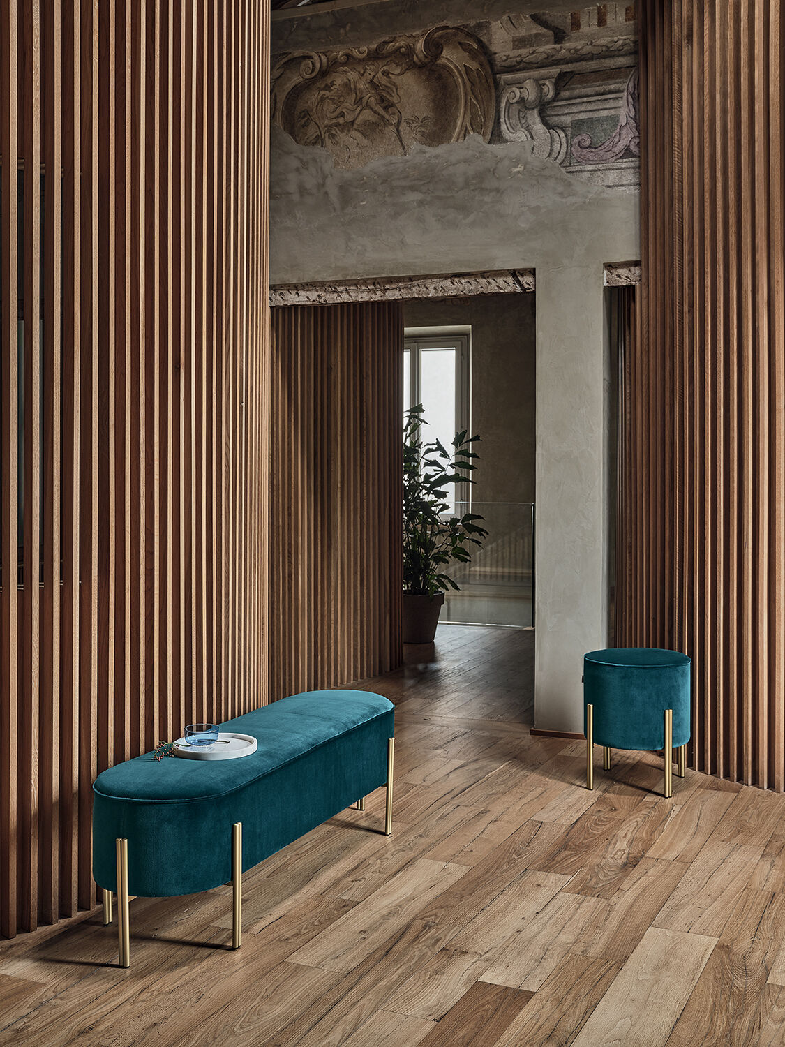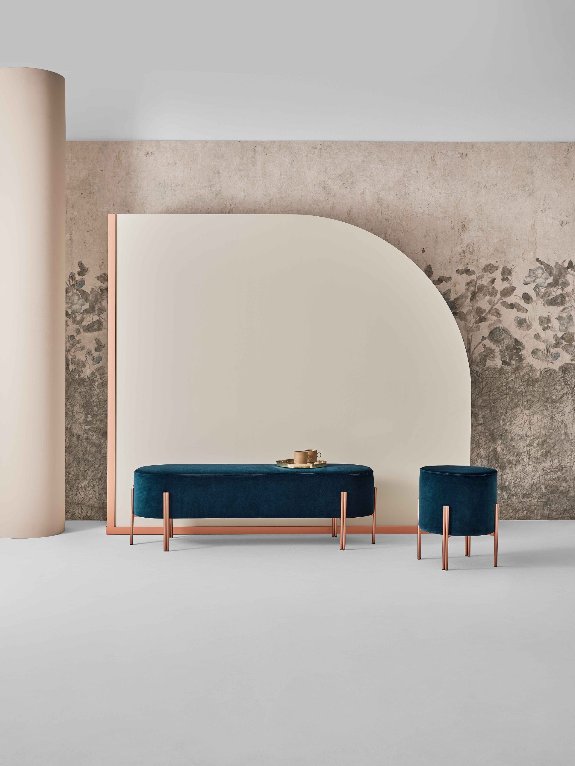 Банкетка со структурой из лакированной стали, в обивке из Экокожи, Экокожи Premium, ткани Bouquet, ткани Nordic, ткани Pure Virgin Wool, бархата Supreme, ткани Kvadrat Field, ткани Kvadrat Coda и кожи Premium.