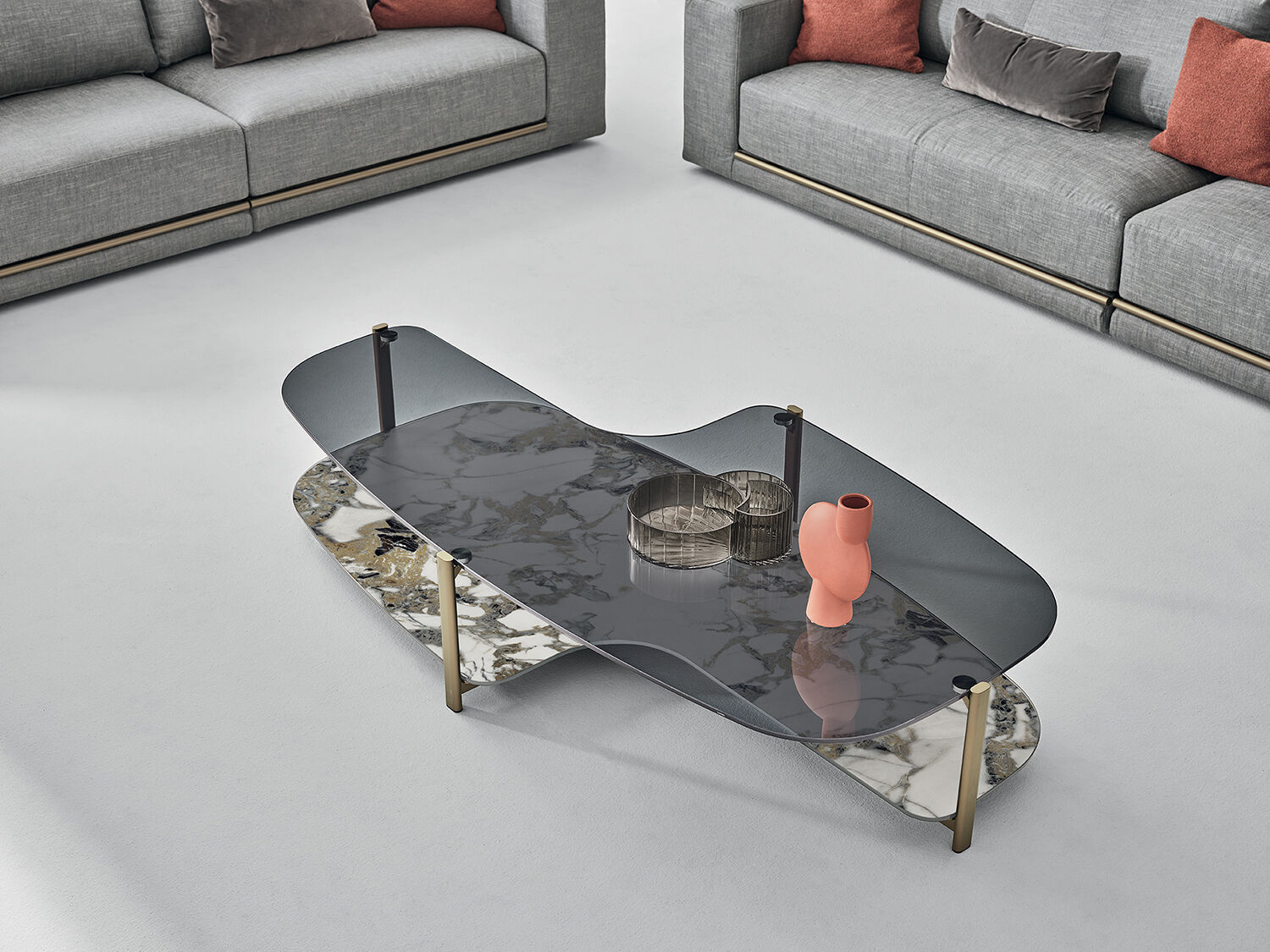 Non tutti i tavolini da caffè hanno un contenitore incorporato o un ripiano sul quale appoggiare cestini portaoggetti o riviste, come il modello di coffee table Pagoda, dalla sagoma sinuosa e asimmetrica.
