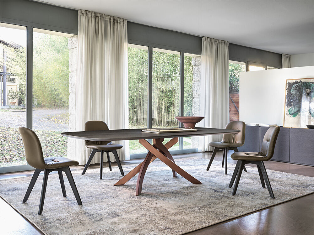 Il consiglio di Bontempi: mix&match di sedie Chantal con struttura in legno massello e seduta in pelle premium color mogano, blu, curry o sabbia e tavolo Delta rettangolare con struttura in acciaio laccato e piano in SuperCeramica o SuperMarmo.