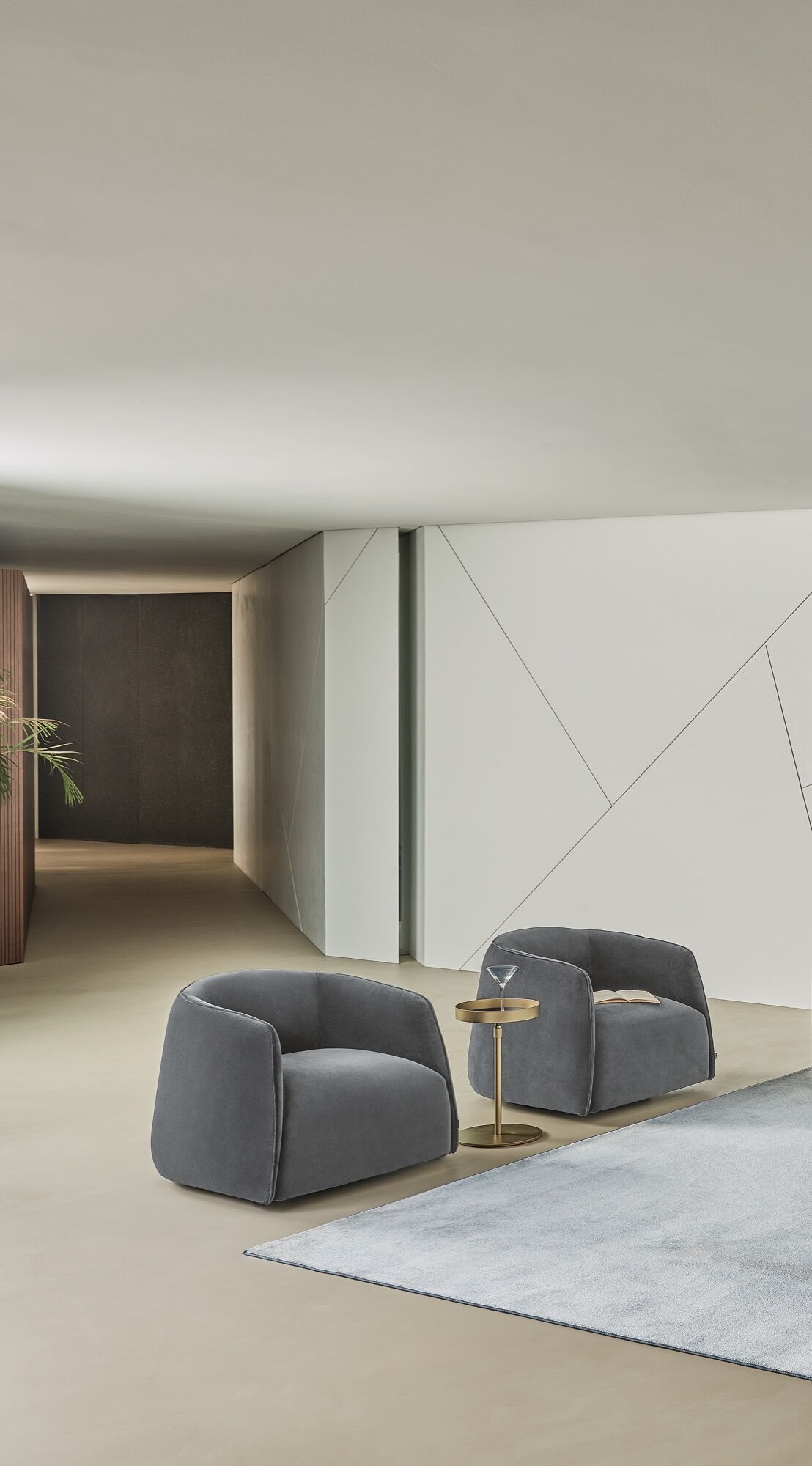 Harmony, discretion, softness, hospitality. There are endless references to describe this armchair designed by a line that follows itself gently, without ever stopping. Enveloping gentle like a hug, it is not a simple armchair but a microcosm of comfort that welcomes and protects after an intense and long day.