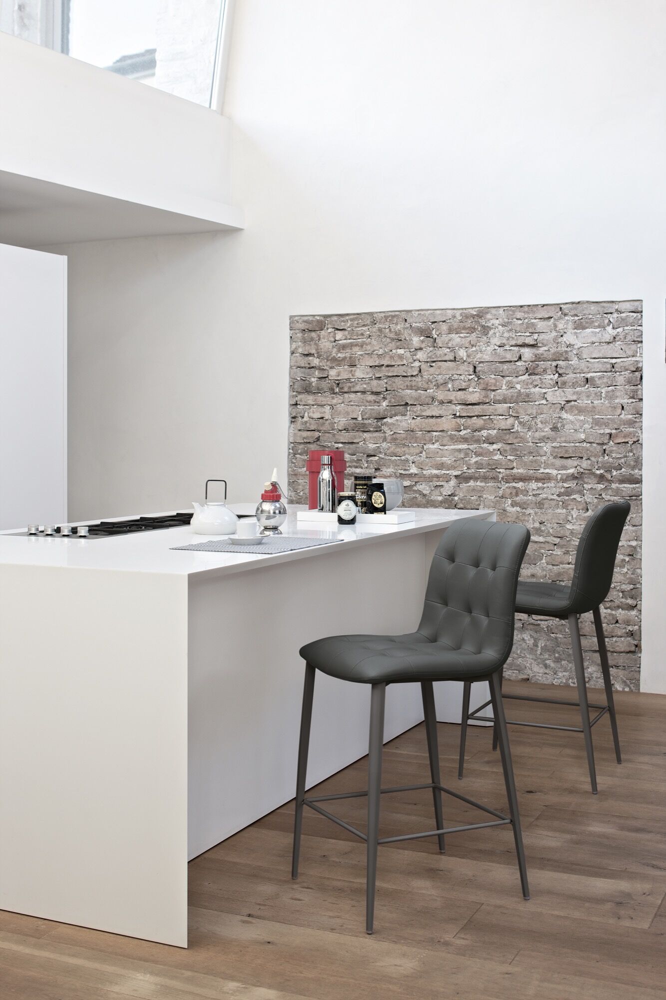 Barstool with lacquered metal frame. Upholstered and covered shell in Bouquet fabric, Nordic fabric, Pure Virgin Wool, Supreme Velvet and Premium Nappa Leather.