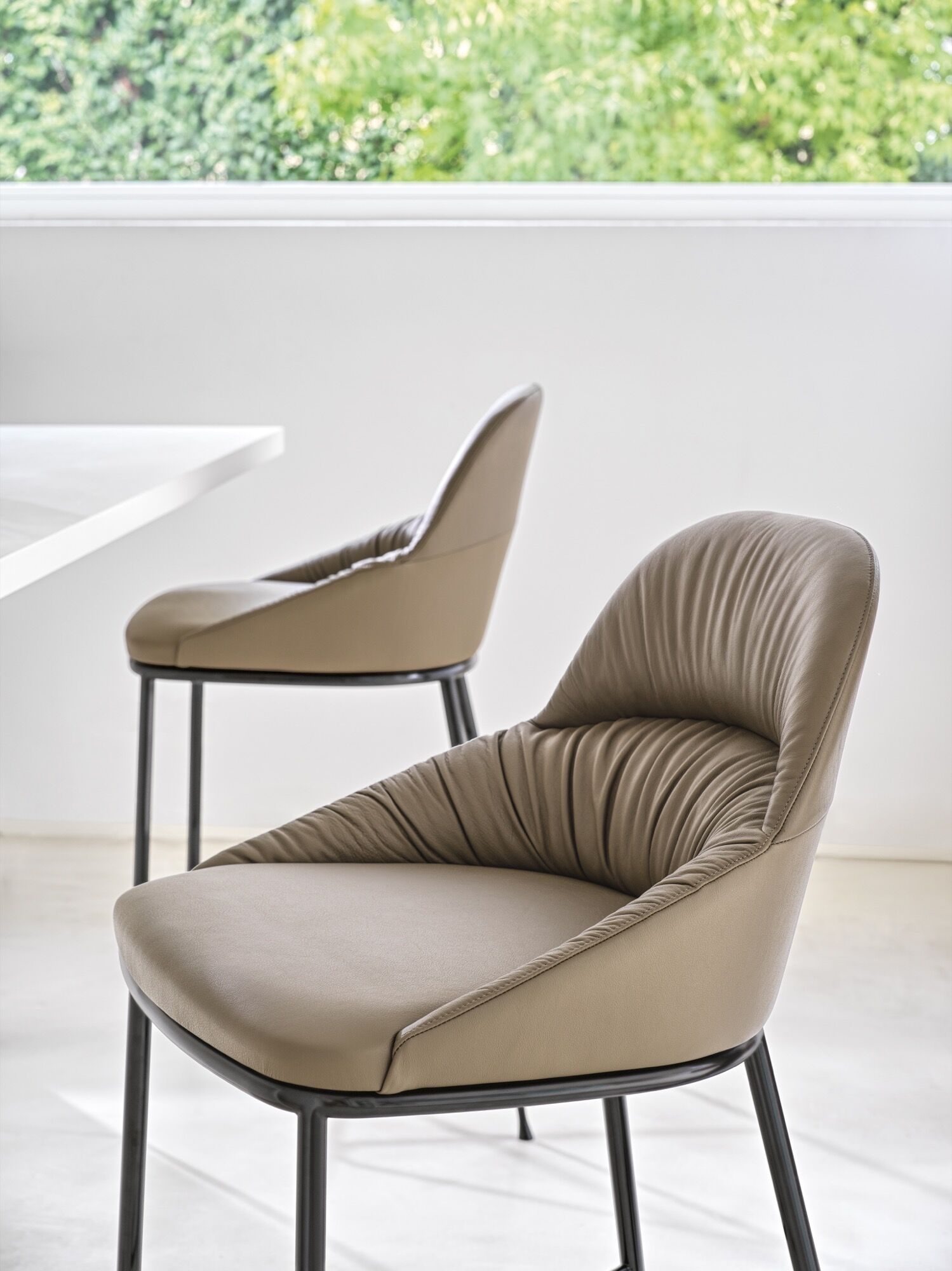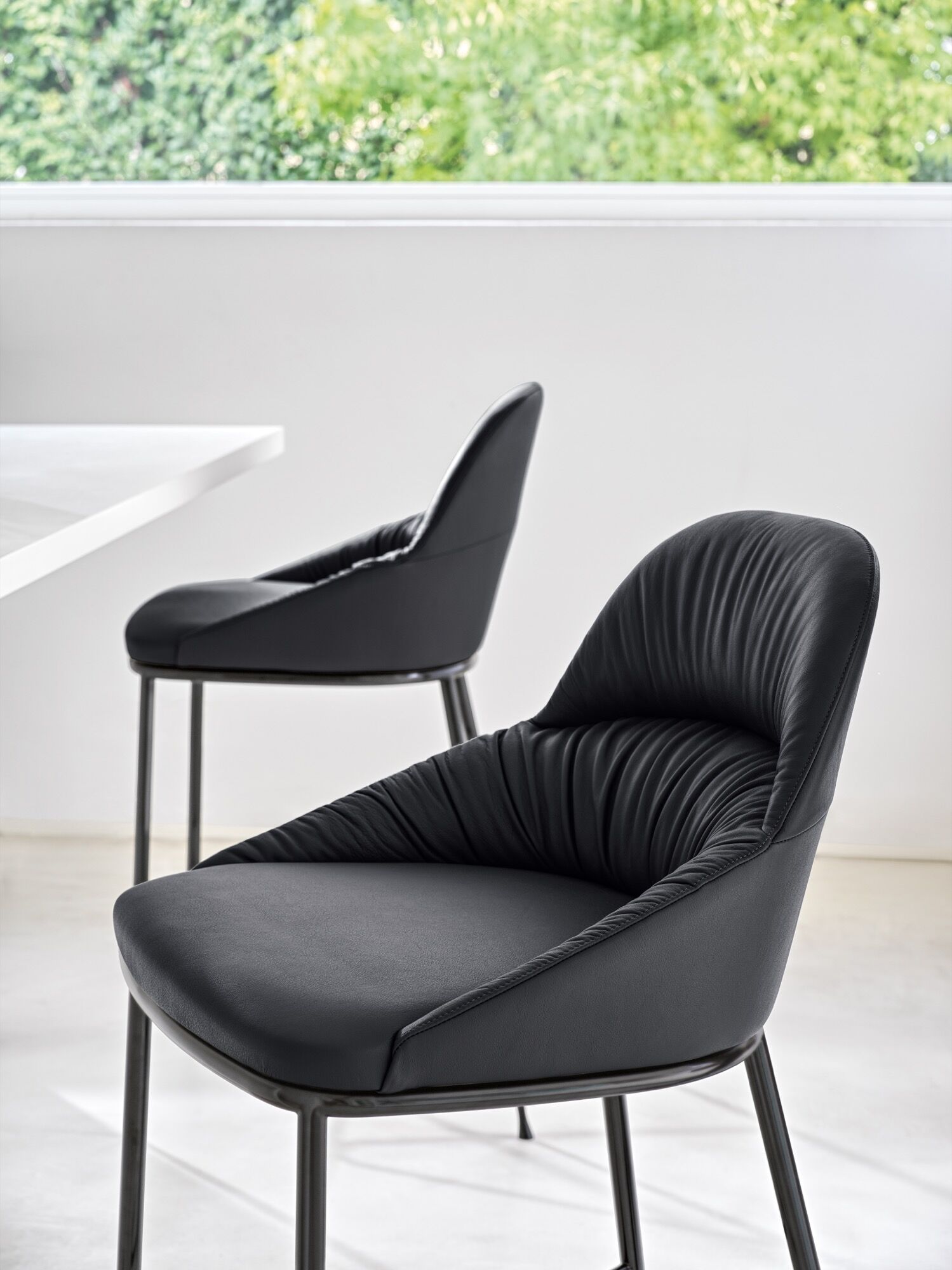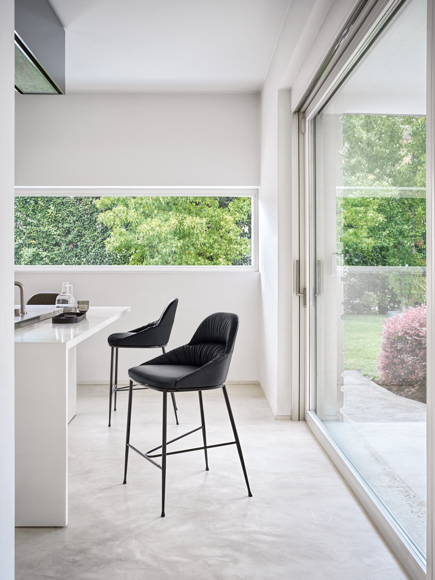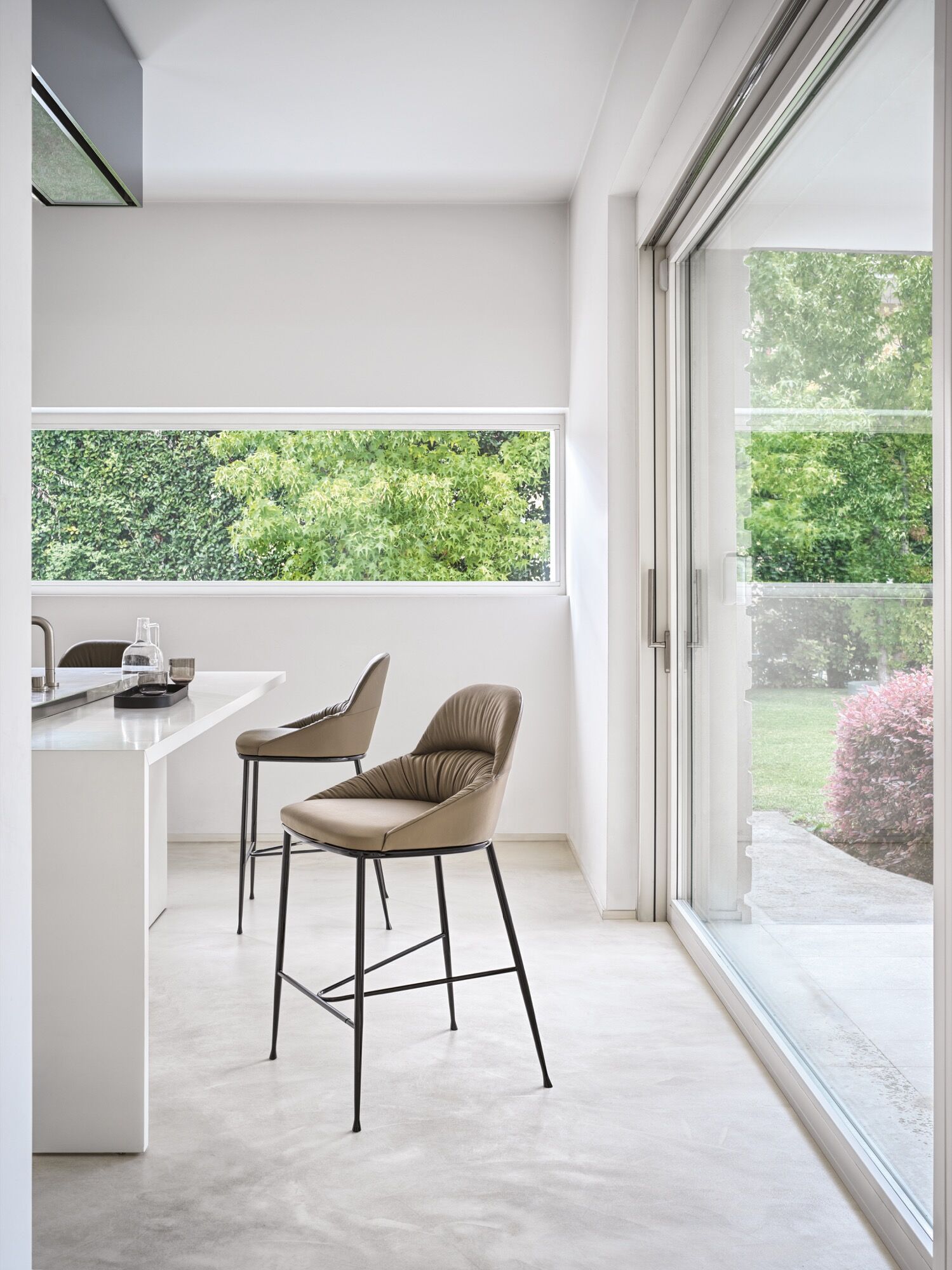 Low barstool with metal frame, upholstered and covered shell in Premium Eco leather, Bouquet fabric, Gourmet fabric, Nordic fabric, Pure Virgin Wool, Supreme Velvet, Kvadrat Field fabric, Coda fabric and Premium Leather.